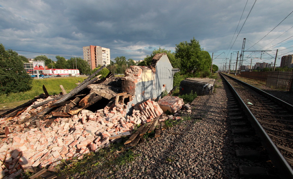 Возле железнодорожной станции Проспект Славы разрушили старинное здание, предположительно напоминавшее о находившемся здесь переезде. Это произошло после недавнего пожара.