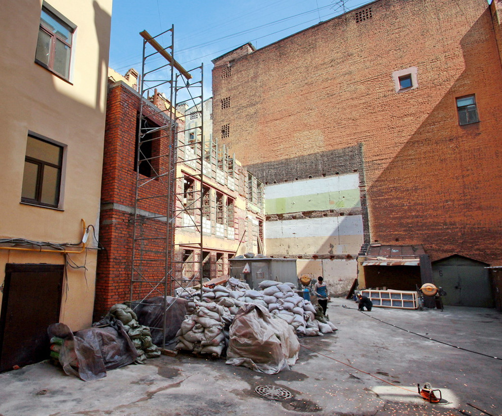 На 3-й Советской улице, 4, реконструируют советский дворовый флигель. Его частично снесли, частично дополнили новым кирпичным объемом, но власти утверждают, что это капитальный ремонт.
