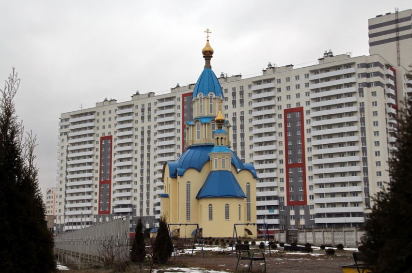 В поселке Парголово завершилось строительство жилого дома на углу Тихоокеанской улицы и Михайловской дороги. Он стал фоном для Благовещенской церкви.