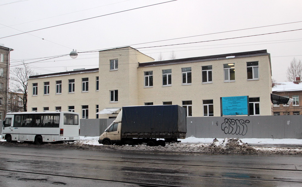 Трехэтажное здание из силикатного кирпича появилось ориентировочно в начале 1990-х годов. Оно строилось как общежитие ленинградского Трамвайно-троллейбусного управления, но работы были брошены. Два десятка лет недострой числился на балансе Горэлектротранса, однако предприятие не стремилось завершить объект. В 2012 году там поясняли «Канонеру», что «вопрос решается».