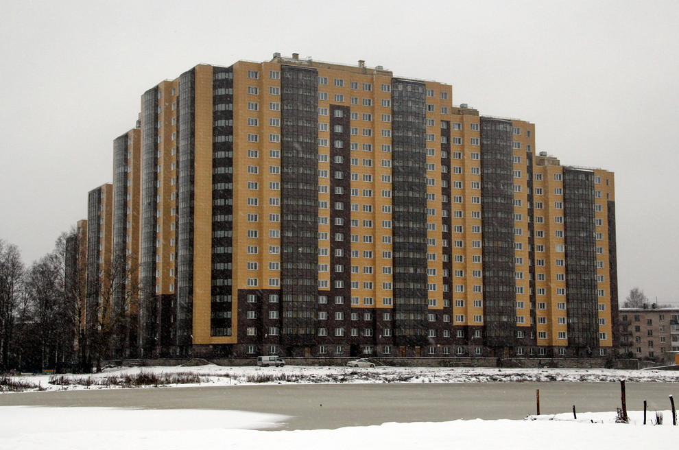 На берегу безымянного пруда в Металлострое сдали 18-этажный жилой дом. Эту кирпично-бетонную стену, спроектированную в Чувашии, возводили больше десяти лет.