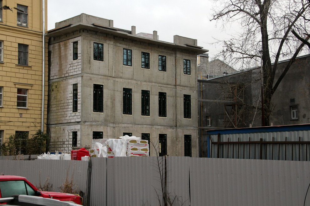 Но, как стало известно «Канонеру», проект был переработан, и в итоге дом строят трехэтажным. «В художественном оформлении здания применяются исторические элементы, характерные для рядовой застройки Петербурга. Архитектурные решения фасадов здания направлены на реализацию концепции сохранения исторической преемственности и характеристик исторической среды», — рассказали изданию в ООО «Архитектурная мастерская Юсупова». Эта компания создавала фасады (официально генпроектировщиком числится ЗАО «Бюро техники-проект»).