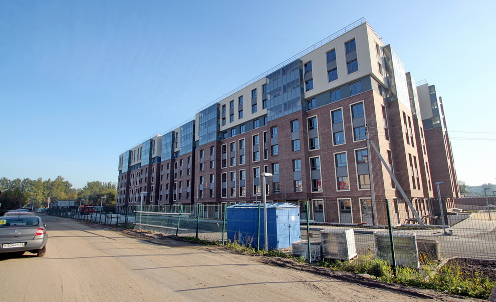 За парком «Новознаменка» на Петергофском шоссе сдали первый жилой дом комплекса, в архитектуре которого использован прием фальшивого ската кровли. Его выделили визуально, но в реальности не строили.