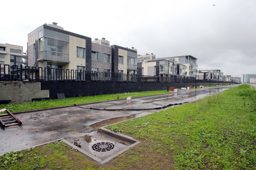 На берегу Дудергофского канала напротив Южно-Приморского парка продолжается создание малоэтажного жилого комплекса. На текущей неделе компания «Балтийская жемчужина» сдала четыре двухэтажки.
