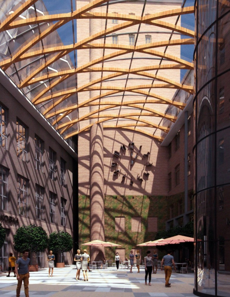 Как стало известно «Канонеру», ООО «Архитектурная мастерская Мамошина» спроектировало новое здание на месте дворового флигеля. Получилась семиэтажная стекляшка. Она вместе с краснокирпичным корпусом — памятником будет составлять бизнес-центр. Между новым объемом и старым создадут атриум. Заказчиком проектирования выступило, однако, не ООО «Антон и К», а некое ООО «Интерос».
