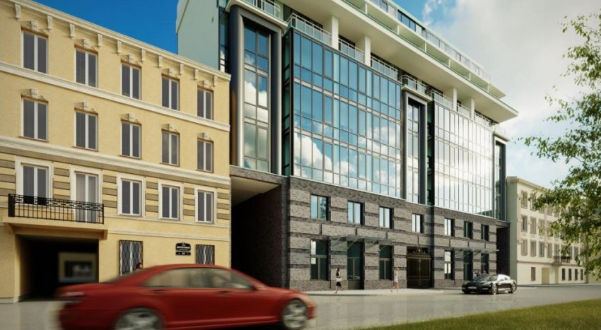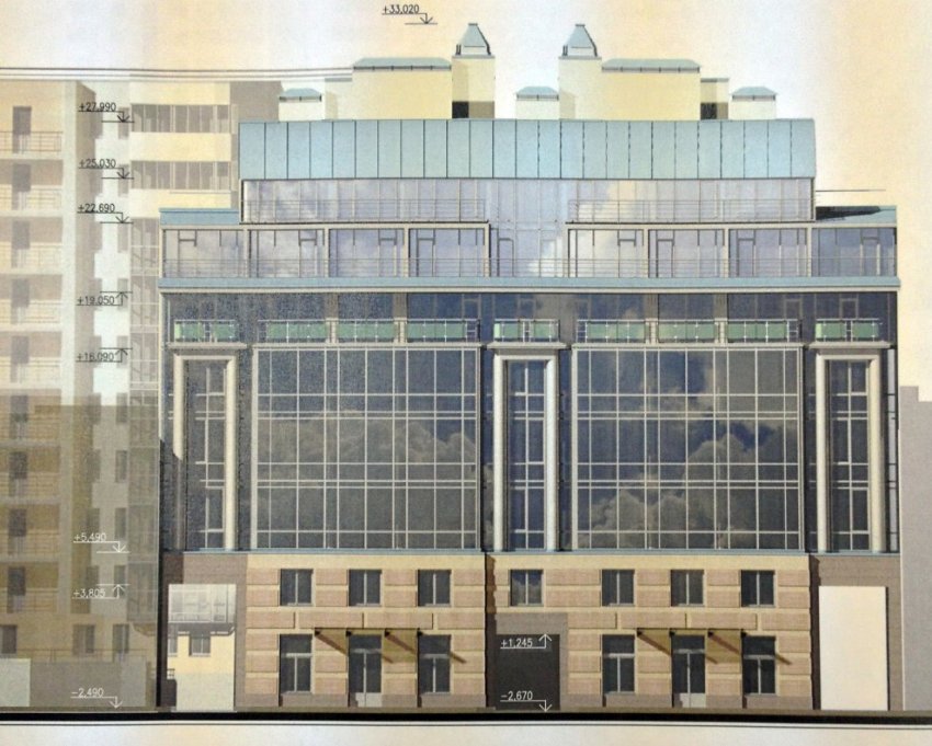Новое объемно-пространственное решение, антиконтекстуальное, сделало ООО «КБ „Сегмент“». Должна получиться восьмиэтажка, притом что примыкают к ней четырехэтажные дореволюционные дома. Два первых этажа новостройки выполнили рустованными, остальные — полностью стеклянными. По фасаду расставят шесть полуколонн. Судя по картинкам, оказавшимся в распоряжении активиста Ярослава Кострова, фасад будет слегка утоплен вглубь квартала.