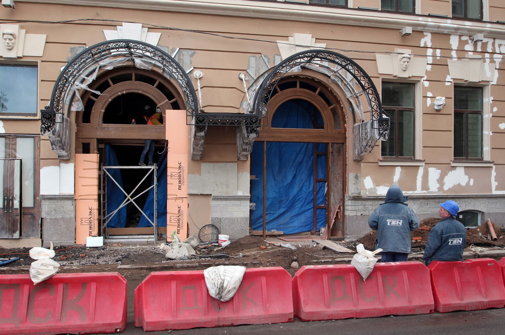 Весной 2013 года на объекте начались первые работы: ООО «Строительная фирма „Ирон“» начало снос дворовых флигелей. Фактически от исторического здания, не числившегося памятником, остались только фасадные стены вдоль переулка и Мойки, причем фасад на Мойке также был частично разобран.