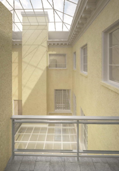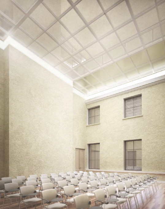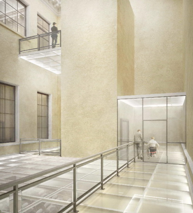 На этой перегородке будет держаться первый этаж — его займет конференц-зал. Сверху сделают еще одно перекрытие — «светопрозрачное». Его будут использовать как галерею для прохода от лифта к фондам и экспозициям. Как утверждают, на этом уровне как раз существовала историческая галерея, подвешенная над двором.