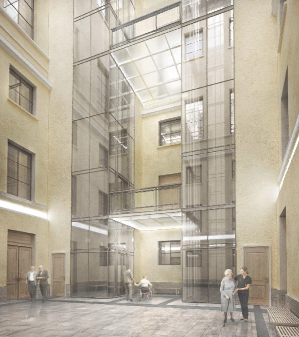 В будущем в рамках второго этапа проекта предполагается построить еще два панорамных лифта в восточном дворе Михайловского дворца. Там перекрытий не ожидается, за исключением небольших площадок перед лифтами.