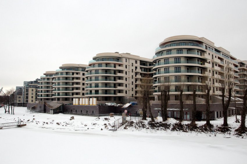 На берегу Малой Невки возле Большого Крестовского моста завершилось строительство жилого дома. К реке он повернут четырьмя крыльями в виде пальцев.