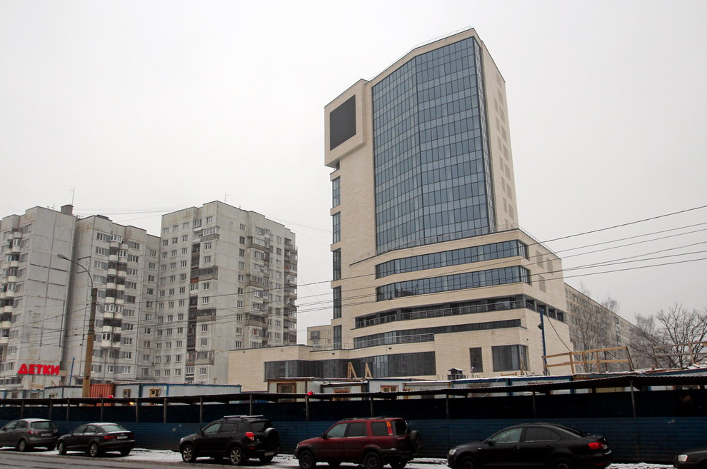 Прежде здесь, на Богатырском проспекте, 3, корпус 3, стоял небольшой магазин, оформленный как «центр социальной защиты населения». Он был построен в 2008 году — по всей видимости, чтобы получить городскую землю в частную собственность. В 2013-м домик снесли, а в апреле 2014-го ЗАО «ССМО „ЛенспецСМУ“» принялось строить здесь «центр обслуживания населения», а по сути бизнес-центр.