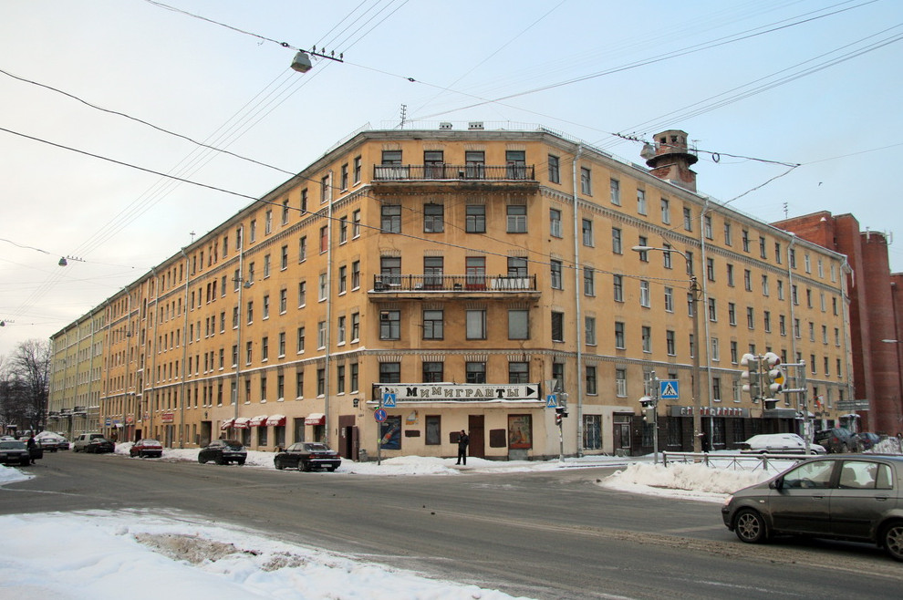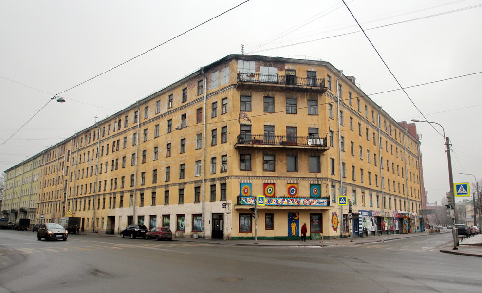 Шестиэтажное угловое здание на Рижском проспекте, 23, было построено в два подхода: в 1900 году создали его левую часть вдоль проспекта (архитектор Иван Гальнбек), а в 1911-м — вдоль улицы (Леонид Котов). До революции это был так называемый Бароновский дом с меблированными комнатами. В советское время здесь создали общежитие Кировского завода.