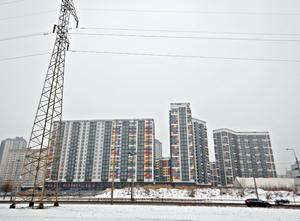 Во дворах на углу Яхтенной улицы и улицы Оптиков завершилось строительство второго жилого дома от группы Legenda, декорированного разноцветными квадратиками. Ранее такой же объект появился по соседству.