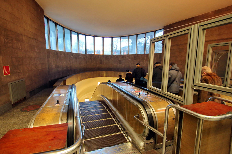 С тех пор была восстановлена гидроизоляция наклонного хода — цементные зонты заменили на композитные. Наладили механизм эскалаторов. Обшивку балюстрад заменили на металлическую. Стоявшие на балюстрадах торшеры демонтировали, а взамен повесили светодиодное освещение на потолке.