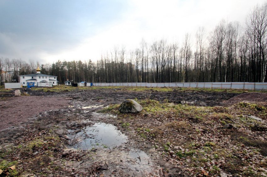 Недавно все деревья, росшие на участке, вырубили. Работы по заказу прихода будущей Воздвиженской церкви ведет ЗАО «ЛенспецСМУ-реконструкция», связанное с АО «ЛенспецСМУ». Проект храма также разработала связанная с девелопером структура — ООО «Эталон-проект».