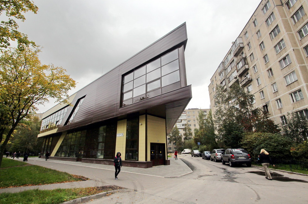 На бывшем газоне на улице Олеко Дундича построили торговый центр. Его выделяет острый угол, устремленный в сторону Купчинской улицы.