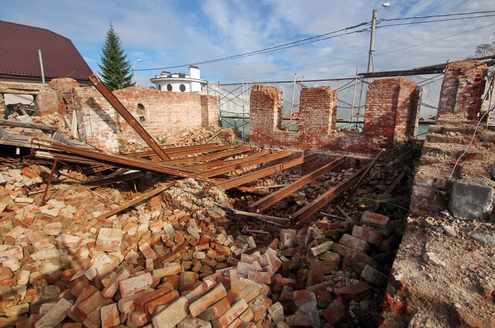 Но вместо восстановления здание частично разобрали: снесли второй этаж и часть первого. Сейчас кирпичи разбросаны по стройплощадке. Очевидно, что стены разбили с установленных здесь же лесов. Когда точно прошел демонтаж, «Канонер» установить пока не смог, но в любом случае это произошло в 2016 году.