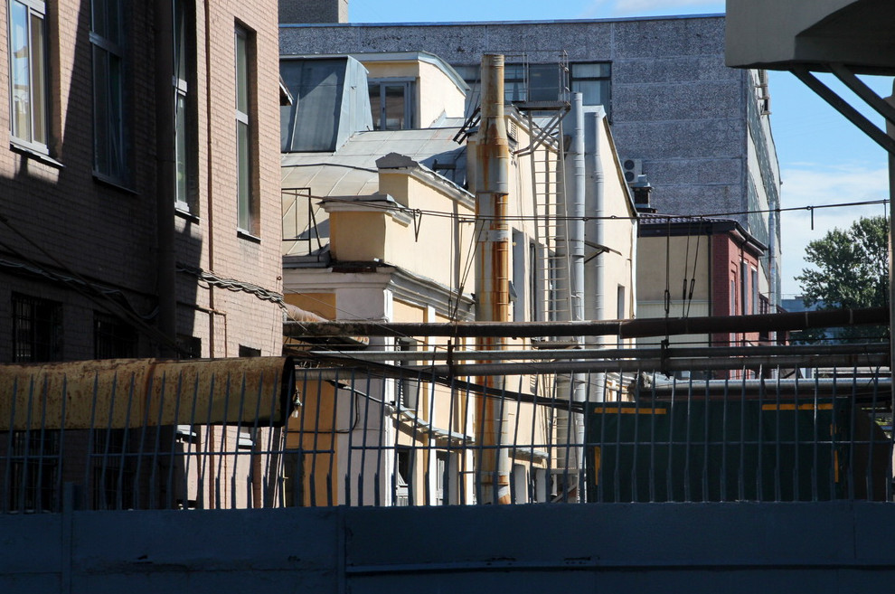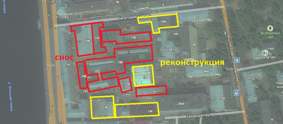Начальник службы строительного надзора Леонид Кулаков рассказал «Канонеру», что в рамках реализации проекта планируется снести два дореволюционных здания (на юридическим языке это называется «разборкой аварийных конструкций») — на Пироговской набережной, 13, литеры В и Е. Литера Е просматривается из-за забора вдоль Евпаторийского переулка. Ранее они принадлежали рафинадному заводу «Кениг и наследники».