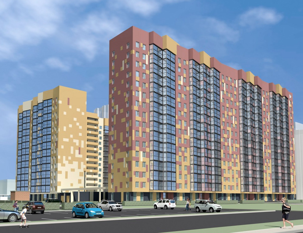 Второе пятно отдали под три типовых жилых дома высотой 13–16 этажей. В плане все они имеют букву Г, причем к проспекту Блюхера один из них выйдет торцом. Фасады максимально упрощены.