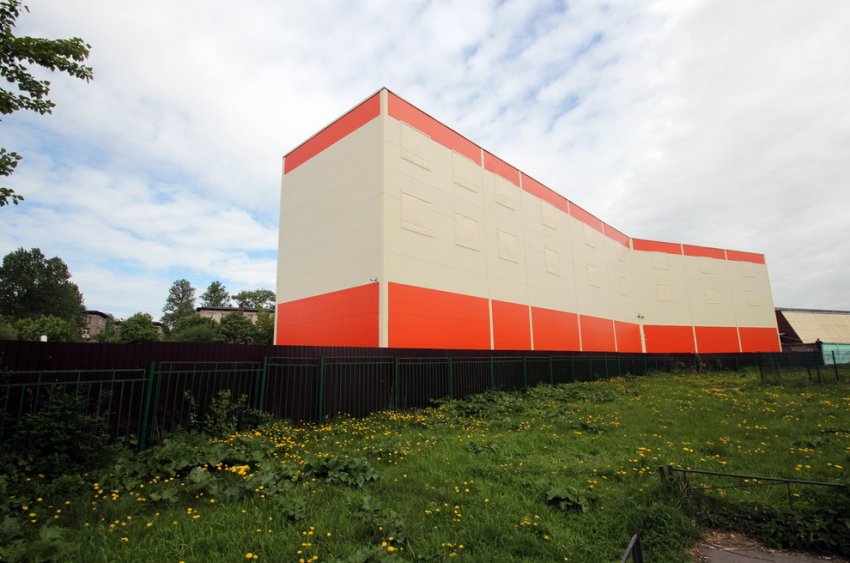 Максимально упрощенная четырехэтажная коробка была готова к концу 2015 года. Она приняла форму участка. На стенах прикреплены металлические панели белого и оранжевого цветов. При этом все окна, выходящие на спортивную площадку школы, полностью заколотили. Возможно, это сделали, чтобы в стекла не попадали футбольные мячи.