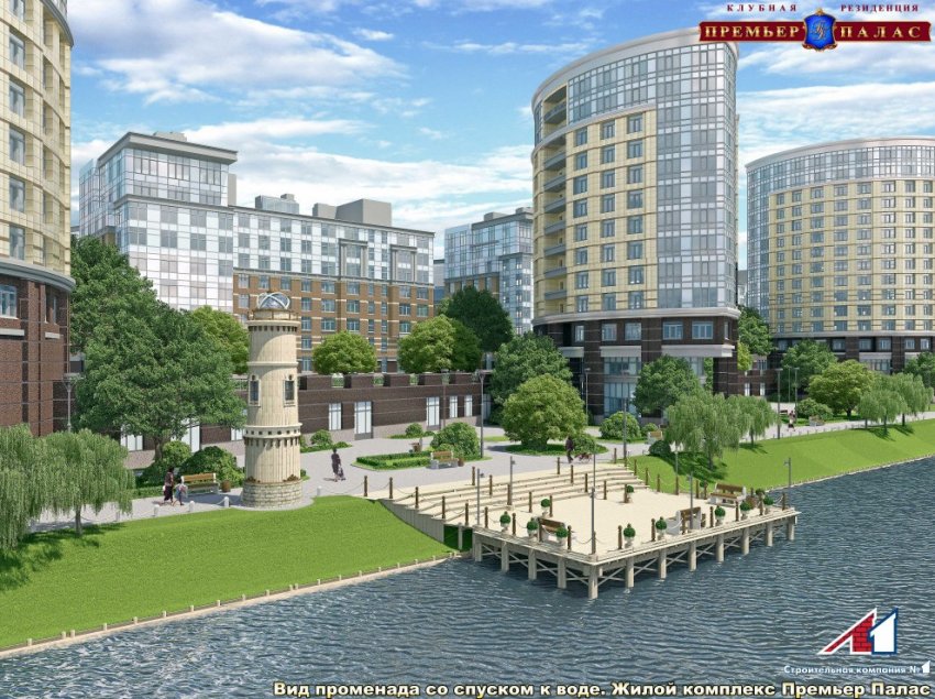 Со стороны реки перед «Премьер паласом» думают поставить декоративный маяк. В третьем квартале нынешнего года здесь собираются открыть пешеходную набережную.