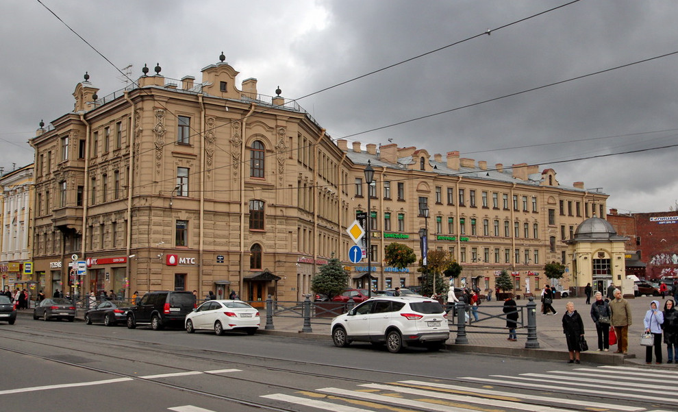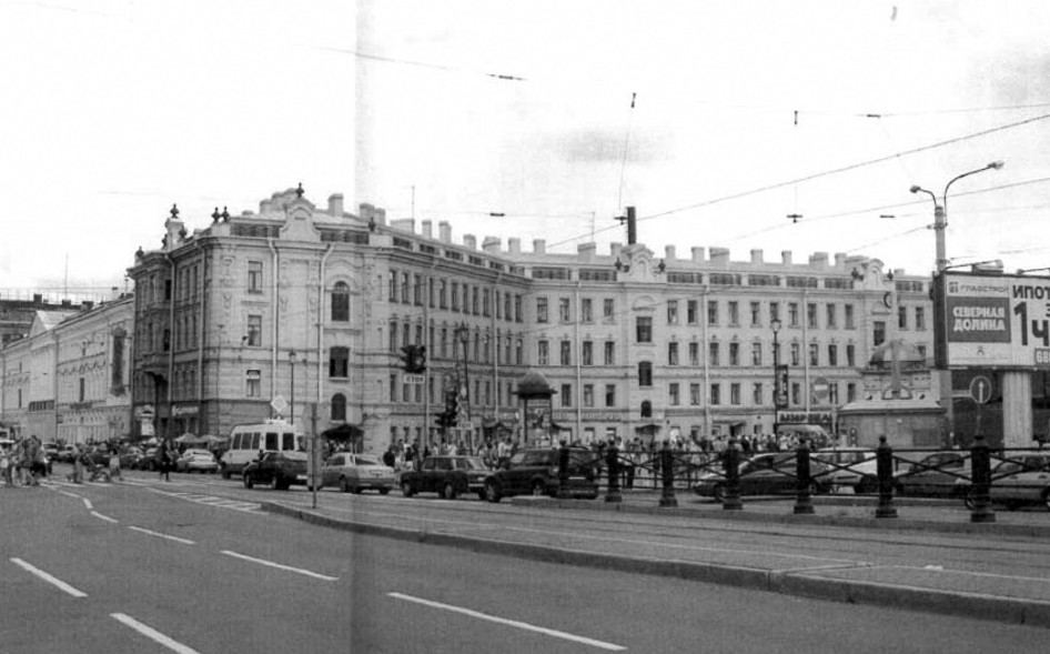 Здание на углу Садовой улицы и Сенной площади было построено в 1878–1880 годах по проекту Григория Карпова. Ломаными фасадами оно огибало стоявшую здесь Успенскую церковь (Спас на Сенной).
