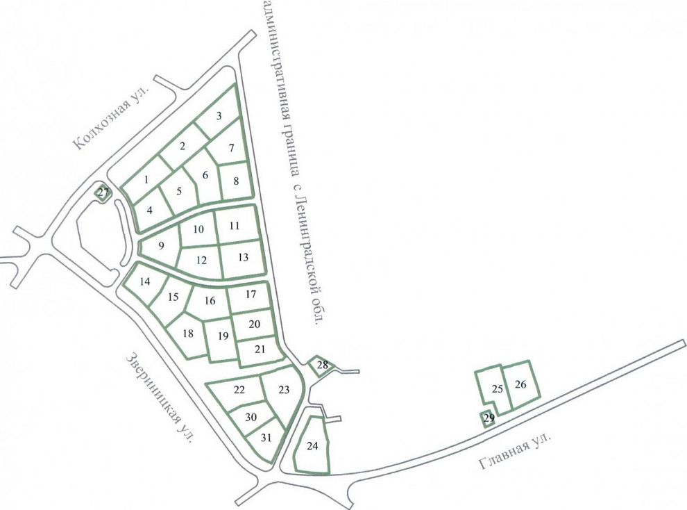 Квартал ограничен Колхозной, Звериницкой, Главной улицами и границей с Ленинградской областью. Сейчас там расположено чуть больше десяти частных жилых домов, но в основном территория не занята застройкой.