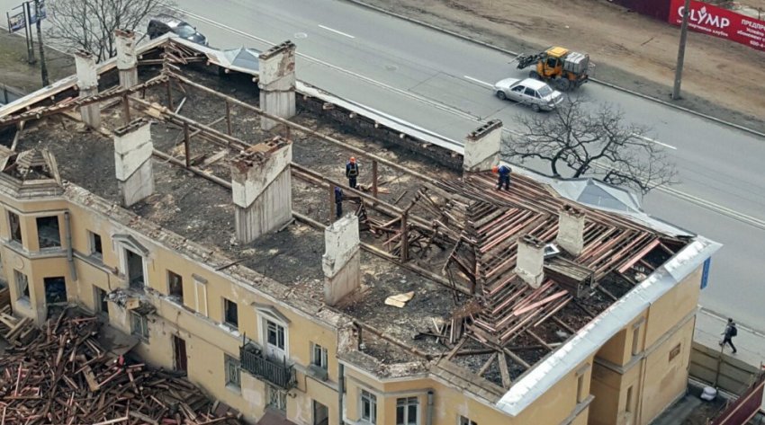 Недавно на заборе появился щит с информацией о начавшемся сносе всех восьми домов. Заказчиком выступает «Строительный трест» (ранее трест всячески отвергал свою причастность к проекту), подрядчиком — ООО «Терминатор». Первым делом приступили к демонтажу кровли и спиливанию деревьев.