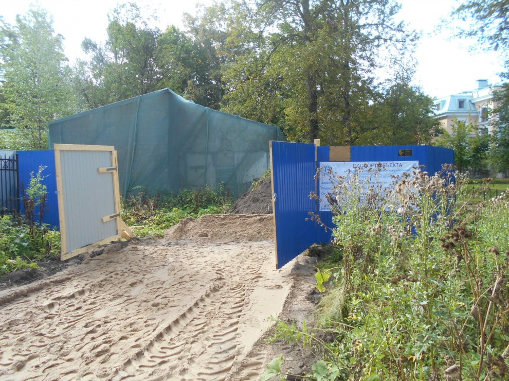 В парке-памятнике на Каменном острове, у особняка Руадзе, бизнесмен строит трехэтажную дачу. Он возводит ее на месте небольших, возможно, дореволюционных хозпостроек.