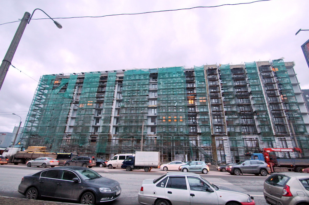 Два первых лицевых корпуса жилого комплекса «Европа-сити», выходящих на проспект Медиков, ввели в эксплуатацию недоделанными. Сейчас продолжаются фасадные работы.