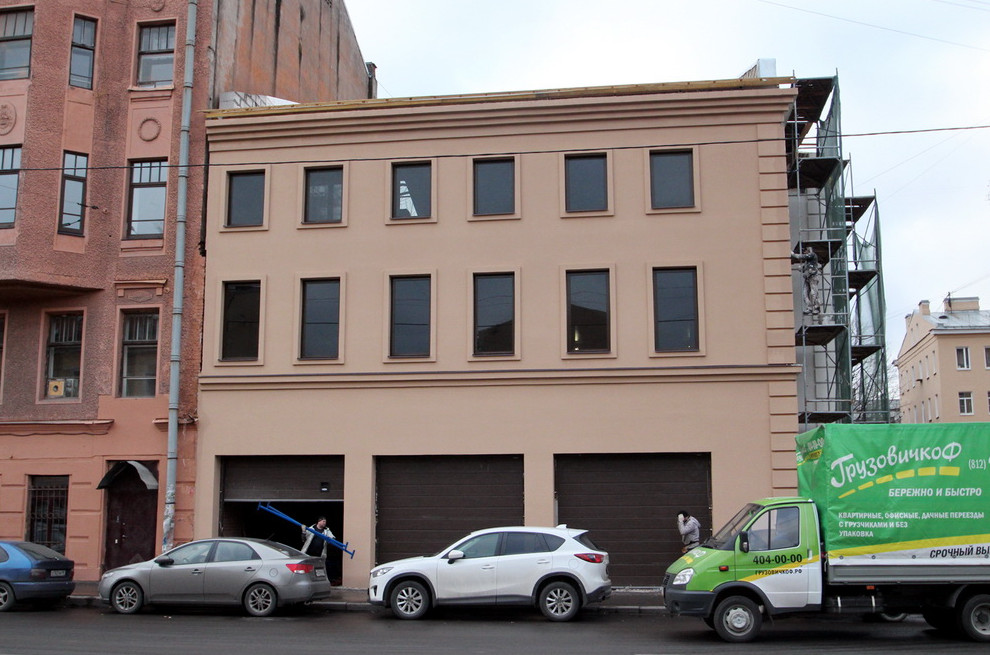 Тем не менее, несмотря на мощь стройнадзора, возведение объекта продолжилось. Сейчас внешне он выглядит готовым. Два верхних этажа имеют окна, форма и частота которых напоминает историческую архитектуру, а первый этаж состоит из трех отсеков для заезда машин — скорее всего, для мойки.