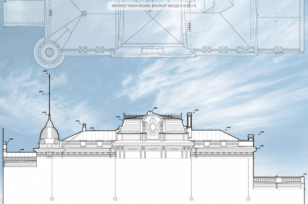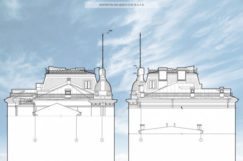 Воссоздаются лепные детали и скульптуры аттика и расположенного перед шатром фронтона; за образец возьмут стилистически близкий фронтон с гербом на Литейном, 42. На краях кирпичного парапета, что на передней грани купола, установят две декоративных вазы, сделанных из фибробетона. Вдоль же фасадной части кровли выставят балясник из силумина.