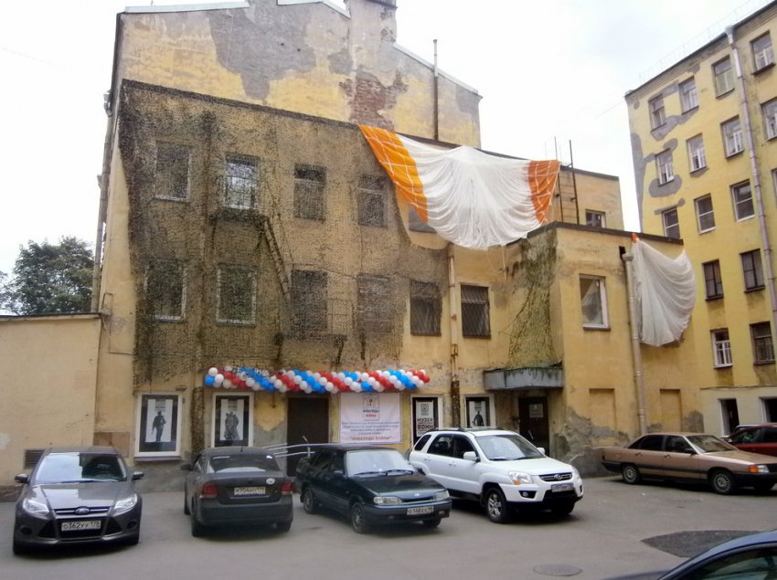 Поверх трехэтажки была натянута зеленая сетка, а также тряпка белого и оранжевого цветов. Что она означает, выяснить так и не удалось. Жители высказывают предположение, что это арт-объект — упавший парашют. «Канонер» направлял запрос «Инвалидам войны», но ответ так и не получил. Сейчас сетка убрана.
