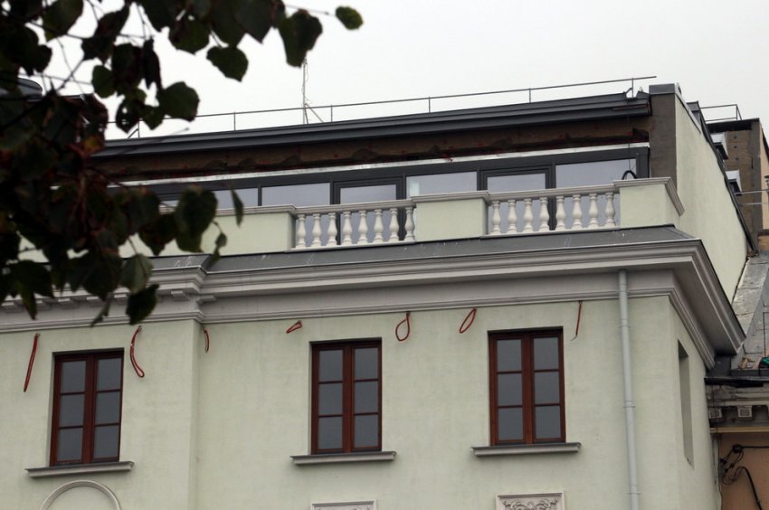 Уличные стены двух «домиков» сделаны трехэтажными. Они имитируют архитектуру середины XIX века, при этом не являются копиями ни утраченного в далеком прошлом дома 21, ни какой-либо другого исторического объекта. Над фасадами вместо скатной кровли сделана терраса. К обеим террасам выходят панорамно остекленные этажи, и эта примета современности видна с обеих сторон набережной Лейтенанта Шмидта. Из общей архитектуры под старину выбивается и арка — полутораэтажная и прямоугольная.