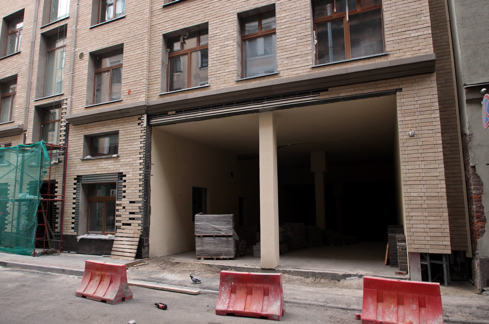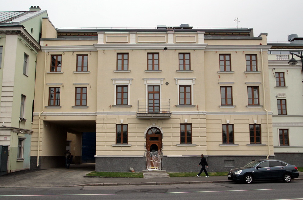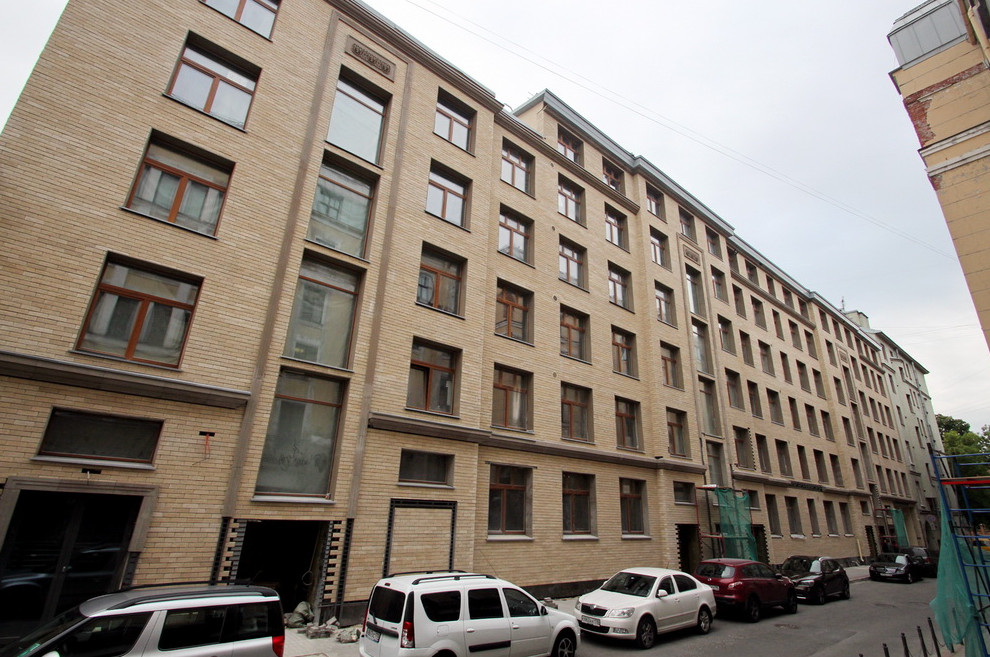 Второй фасад выходит в Иностранный переулок. Это шестиэтажная стена с крупными квадратными окнами и плиточной облицовкой. Дворовую каретную приспособили под трансформаторную подстанцию без ее сноса.