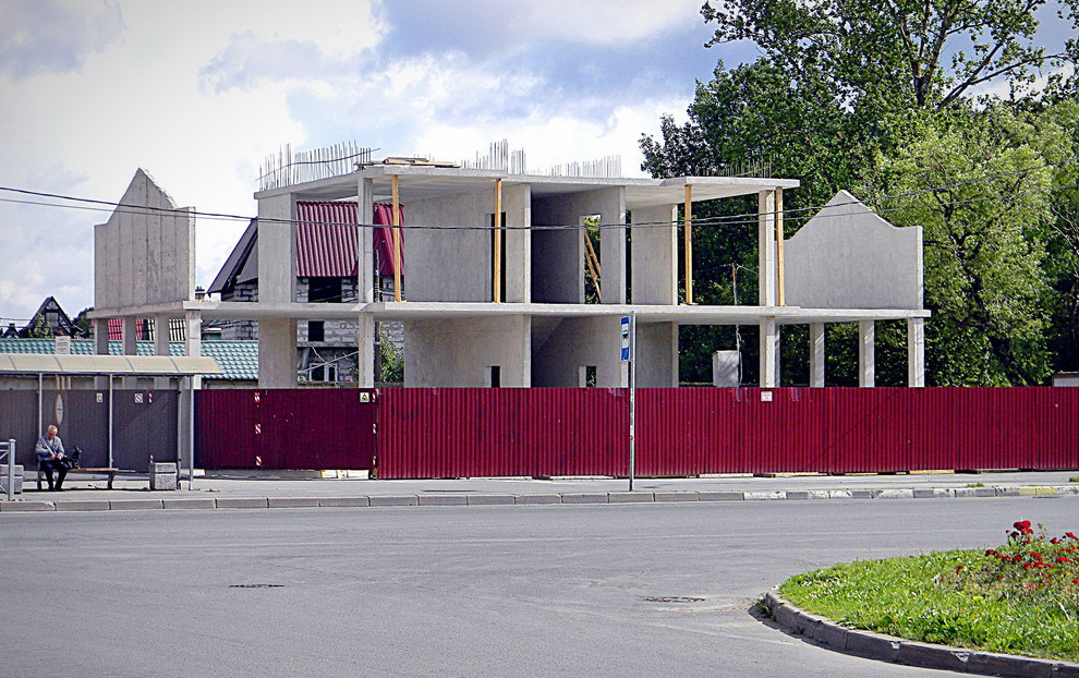 Двухэтажное здание банка строят на улице Халтурина, 1, напротив станции Старый Петергоф. За два года до начала работ кто-то спалил стоявшее там кафе.