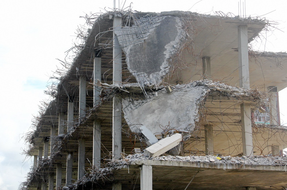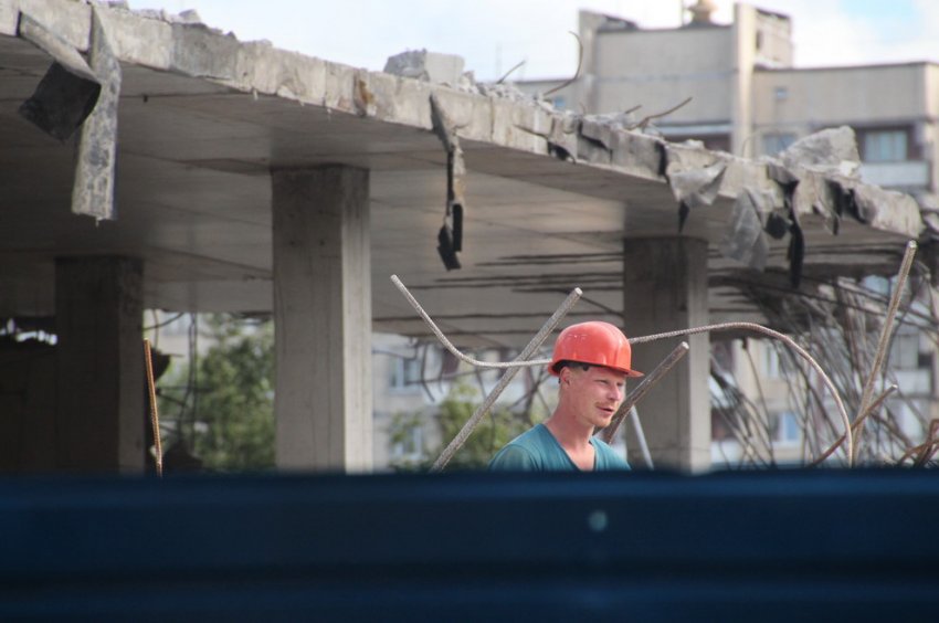 На проспекте Ударников, 34, ведется снос железобетонного каркаса недостроенного торгового центра. В ходе демонтажа часть зданий обвалилась.