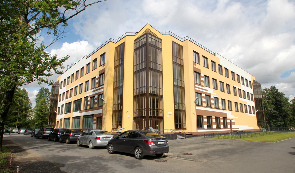 Новое здание четырехэтажное, главный вход с пандусом организован через остекленный угол. Похожие элементы, но в виде лоджий, выполнены на двух других углах.