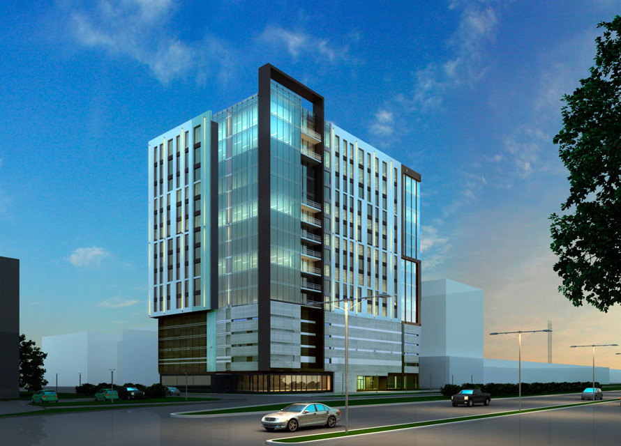 Любопытной особенностью проекта стал пятиуровневый надземный гараж примерно на 200 машин, который встраивается между первым и седьмым этажами. На крыше паркинга, частично выходящего за пределы заднего фасада бизнес-центра, расположится конференц-зал.