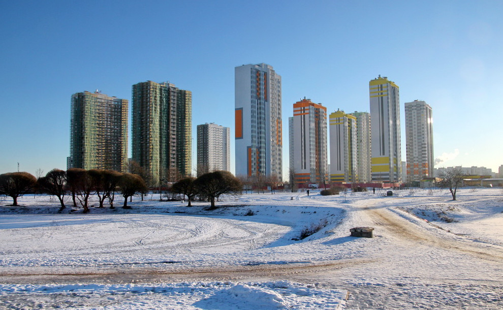 После подготовки территории началось строительство жилого комплекса «София», состоящего из девяти 25-этажных зданий. Они однообразны, но проектировщик (им числится ЗАО «Домостроительный комбинат „Блок“») предложил их раскрасить в яркие оранжевые, желтые и зеленые цвета. Работы по возведению «Софии» оказались незаконными; начальник службы строительного надзора Леонид Кулаков докладывал нашему изданию, что на застройщика ООО «ЛСР. Недвижимость — Северо-Запад» накладывались штрафы.
