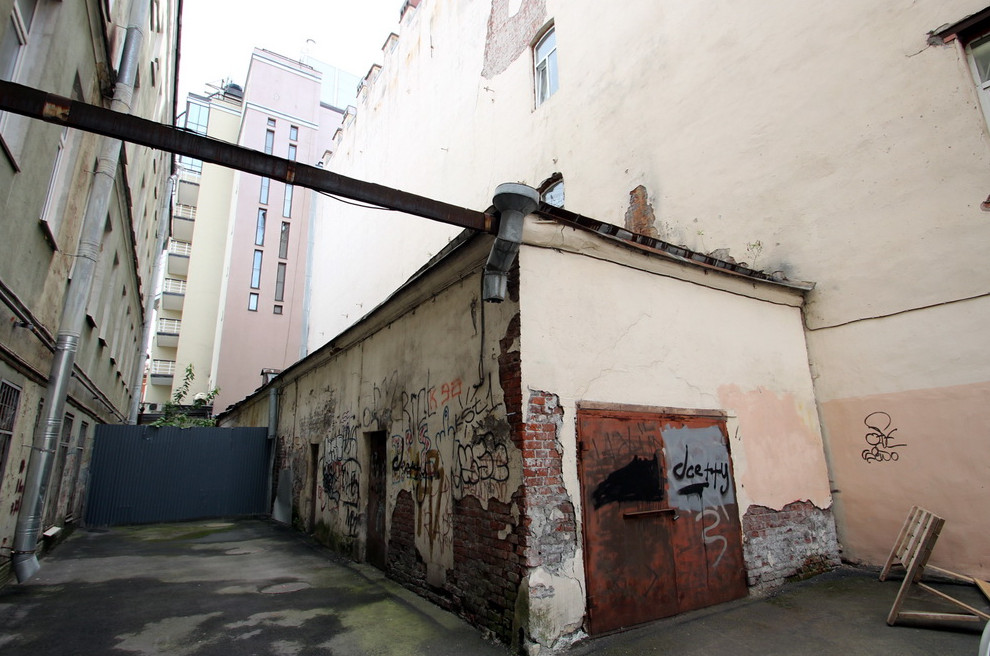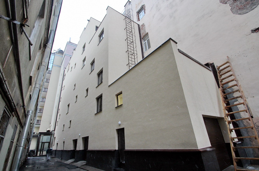 Высоту пришлось сделать ступенчатой, чтобы не закрыть прорубленные в брандмауэре 9-го дома окна. Несмотря на колодезный тип двора, фасады постройки решили разнообразить вольным расположением окон в «стиле» хаотизм.