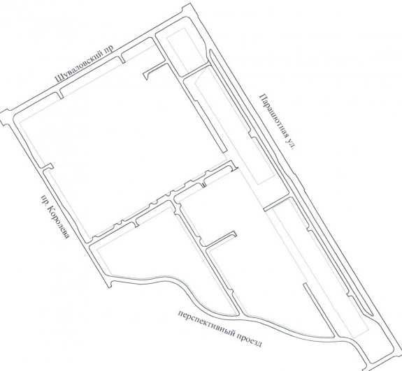 Квартал ограничен проспектами Королева, Шуваловским, Парашютной улицей и пока безымянным проездом по Литориновому уступу. Этот извилистый переулок, который включит также участок от Королева до Шуваловского по соседнему кварталу, возможно, получит название Литориновая улица.