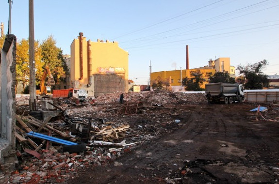 На Большой Зелениной улице, 34, сносят сталинское здание станции технического обслуживания машин ЗАЗ. Взамен группа «Петрополь» возведет жилой дом.