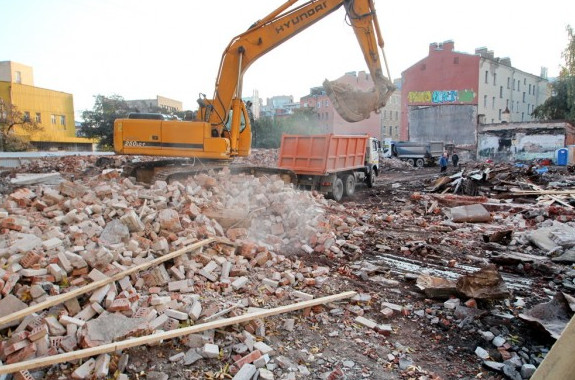 В настоящее время ведется снос «сталинки». Его по заказу «Садко-сити» проводит ООО «Строительная компания „Визор“». Сотрудник фирмы сказал сегодня «Карповке», что работы практически завершены, и сейчас вывозят строительный мусор.