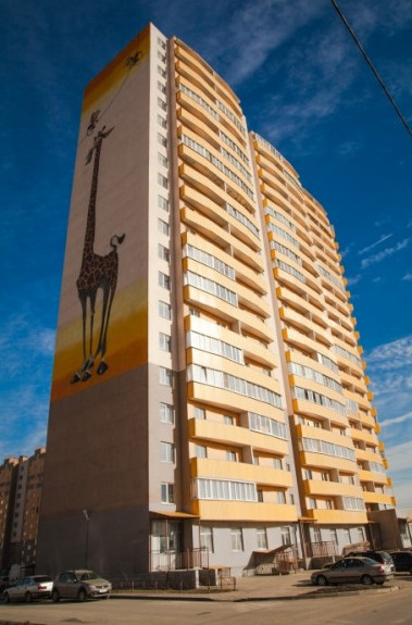 На брандмауэре дома, обращенном на север, изображен жираф. Весной вокруг этого и других похожих рисунков разгорелся скандал: власти попросили затереть животного, потому что его появление не было согласовано.