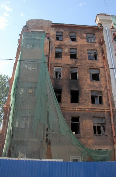Разборка началась в 20-х числах мая. Первыми обрушили двухэтажный дворовый флигель и дом № 11. Побывавший сегодня на площадке корреспондент «Карповки» обнаружил, что осталось разобрать только фрагмент 9-го дома. Охранять стройку посадили плюшевую собаку.