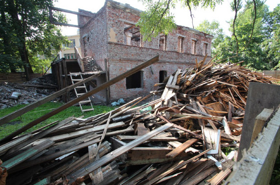 Историческое здание на Константиновской улице, 12, в Петергофе оказалось полностью вычищено от всех внутренних конструкций. Районные чиновники не смогли объяснить, что за работы ведутся на объекте.