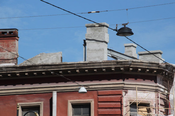 Начались работы по приспособлению под гостиницу старинной гимназии Гуревича на Лиговском проспекте, 1. Постройка уже лишилась кровли, на месте которой будет обустроена мансарда.