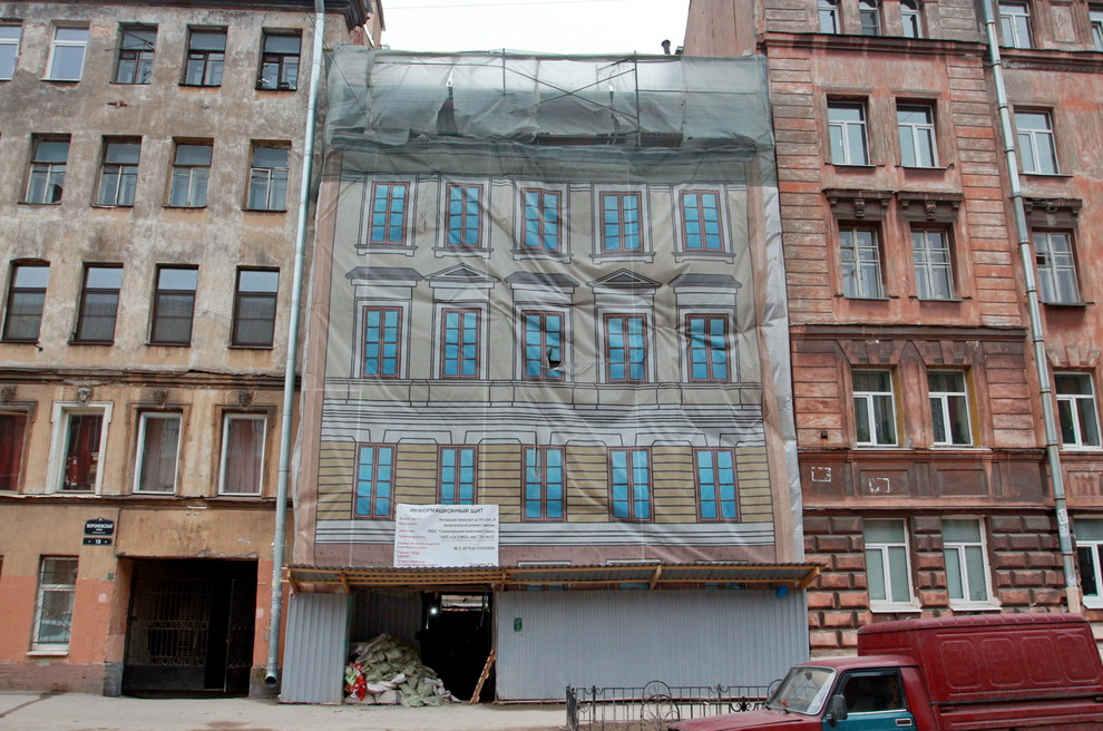 На Воронежской улице капитально ремонтируют расселенный жилой дом. До начала работ он не имел фасадного убранства, но его обещают сделать. Дом Елизарова числится по Лиговскому проспекту, 141, литера Л, хотя выходит только на Воронежскую улицу. Он был построен в 1897 году по проекту архитектора