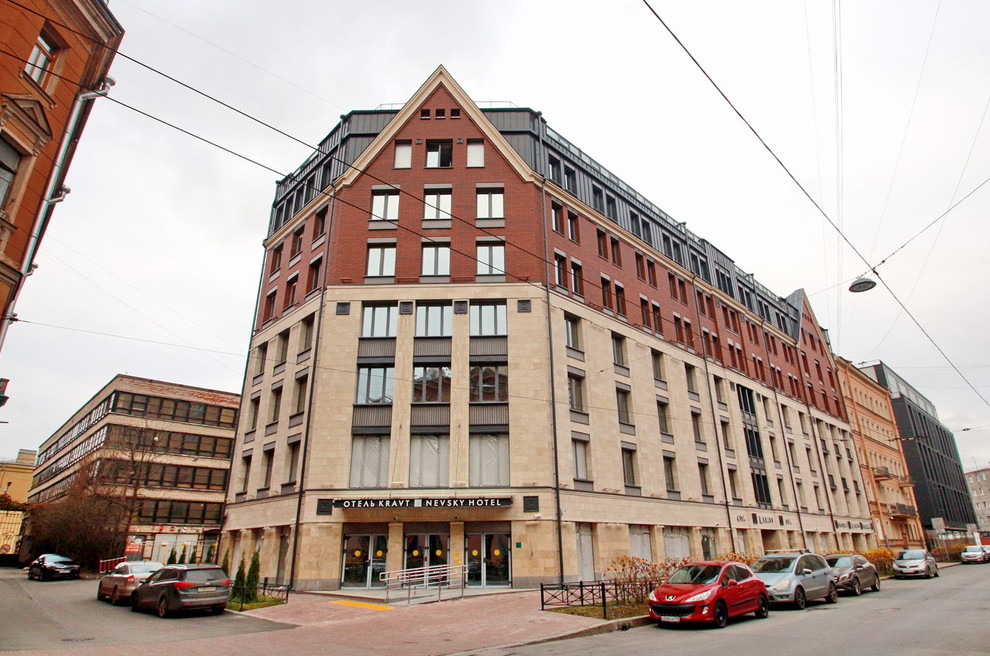 Отель семиэтажный. Он получился угловым: боковой фасад сохранил трассу упраздненного Исидоровского переулка. Фасад выделен двумя «фронтонами» с окнами. Проект делало ООО «Проекс».